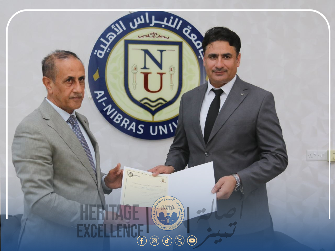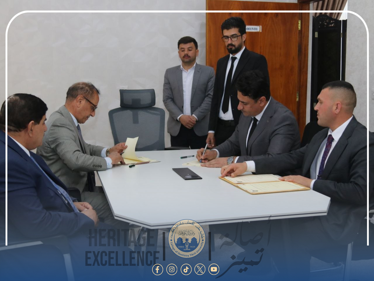 في إطار تعزيز التعاون الأكاديمي وتبادل الخبرات العلمية، أبرمت كلية طب الأسنان في جامعة تكريت اتفاقية تعاون مشترك مع كلية طب الأسنان في جامعة النبراس الأهلية، وذلك في قضاء العلم بمحافظة صلاح الدين.